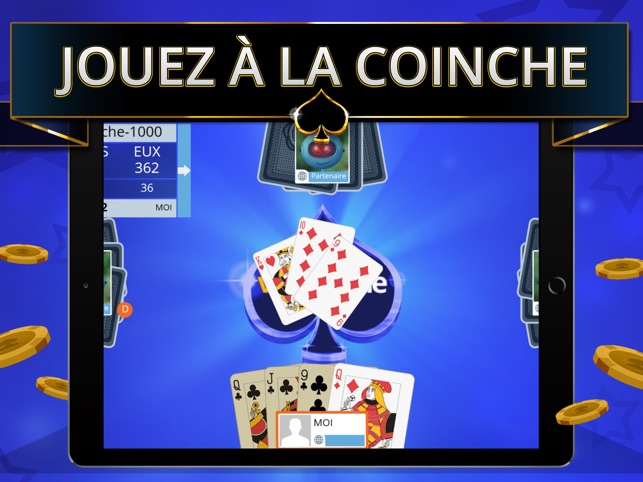Les enchères peuvent aussi être Coinchées (doublées) ou Surcoinchées (quadruplées). Un contrat de 100 Pique Coinché rapporte 200 points si réussi, mais coûte 200 points à l’équipe adverse en cas d’échec. Cette dynamique transforme chaque décision en un pari calculé, mêlant anticipation et audace.